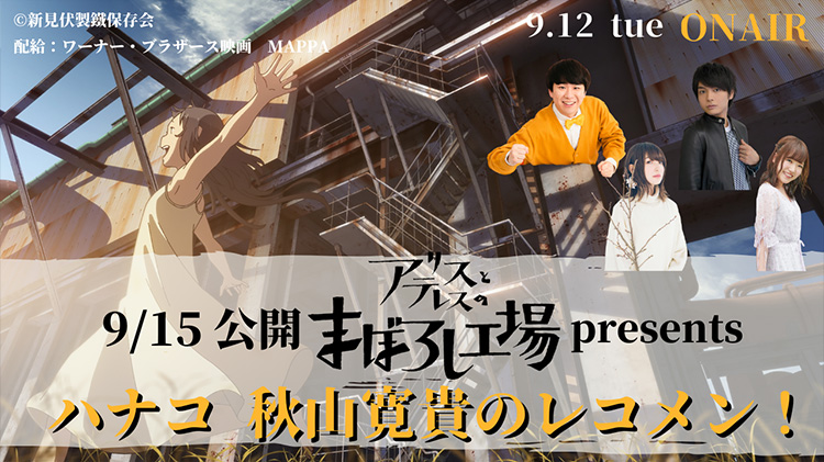 本作の公開を記念して、文化放送(FM91.6 & AM1134)にてスペシャル番組『映画「アリスとテレスのまぼろし工場」presents ハナコ秋山寛貴のレコメン!』を9月12日(火)午後10時00分より放送することが決定しました!