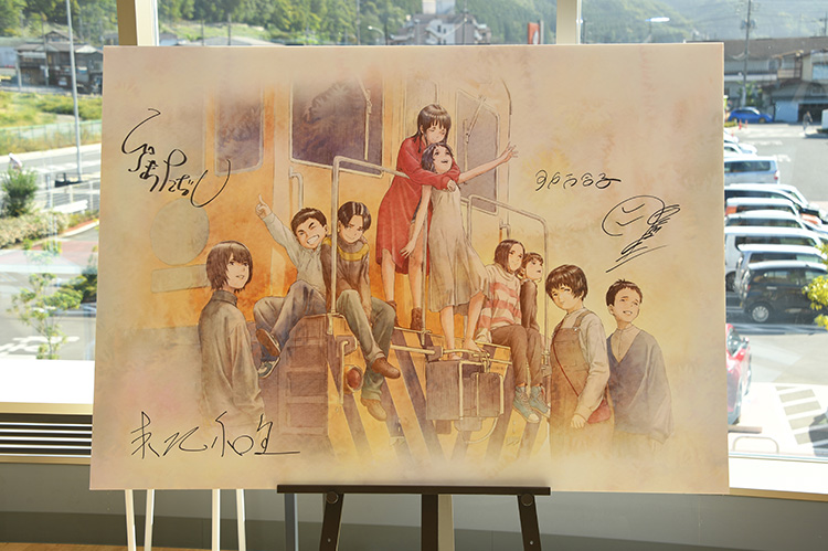 当日、ステージの上には、この日初公開された、石井と東地が描いた最新のビジュアルのパネルが設置されていました。6週連続入場者プレゼントのラストを飾るプレゼントに使用されるこのビジュアルについて聞かれたキャラクターデザインの石井百合子は、「このイラストを描くにあたって、シナリオにラスト、みんなを描いた絵があるスケッチブックというト書きだったり、コンテの中に、五実が列車の先頭で手を振っている絵があったので、自分が一番見たい、みんなが一緒にいて一番いい笑顔を描きたいということで、是非書かせてほしいと(このイラストを)描きました。」とイラストに込めた思いを明かしました。